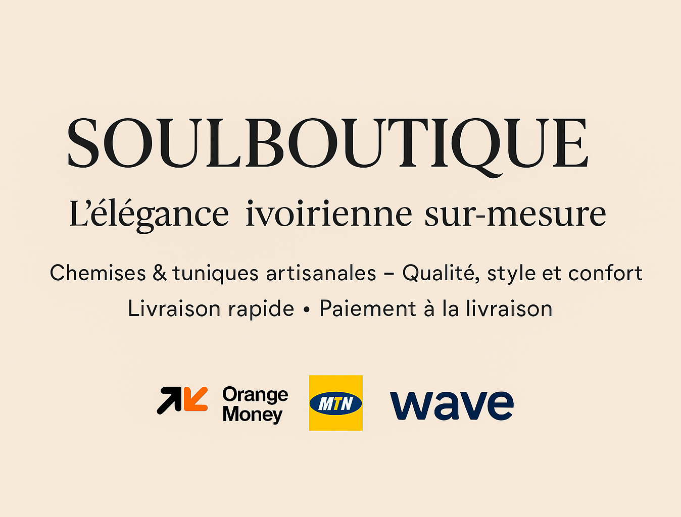 Chez SOULBOUTIQUE, notre mission est de proposer des vêtements prêt-à-porter de haute qualité, faits sur mesure pour refléter l’élégance ivoirienne moderne. Nous mettons un point d’honneur à concevoir des chemises et tuniques à la fois confortables, durables et raffinées, adaptées à tous les moments de la vie : travail, sorties ou événements spéciaux. Chaque création incarne notre passion pour la mode et le design africain.