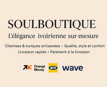 SOULBOUTIQUE est née à Abidjan avec une seule ambition : célébrer l’élégance et le style ivoirien à travers des chemises et tuniques uniques, confectionnées avec soin. Chaque pièce est imaginée et réalisée dans notre atelier, reflétant le savoir-faire local et la créativité africaine. Nous croyons que chaque vêtement doit raconter une histoire et permettre à nos clients de se démarquer avec style et authenticité.